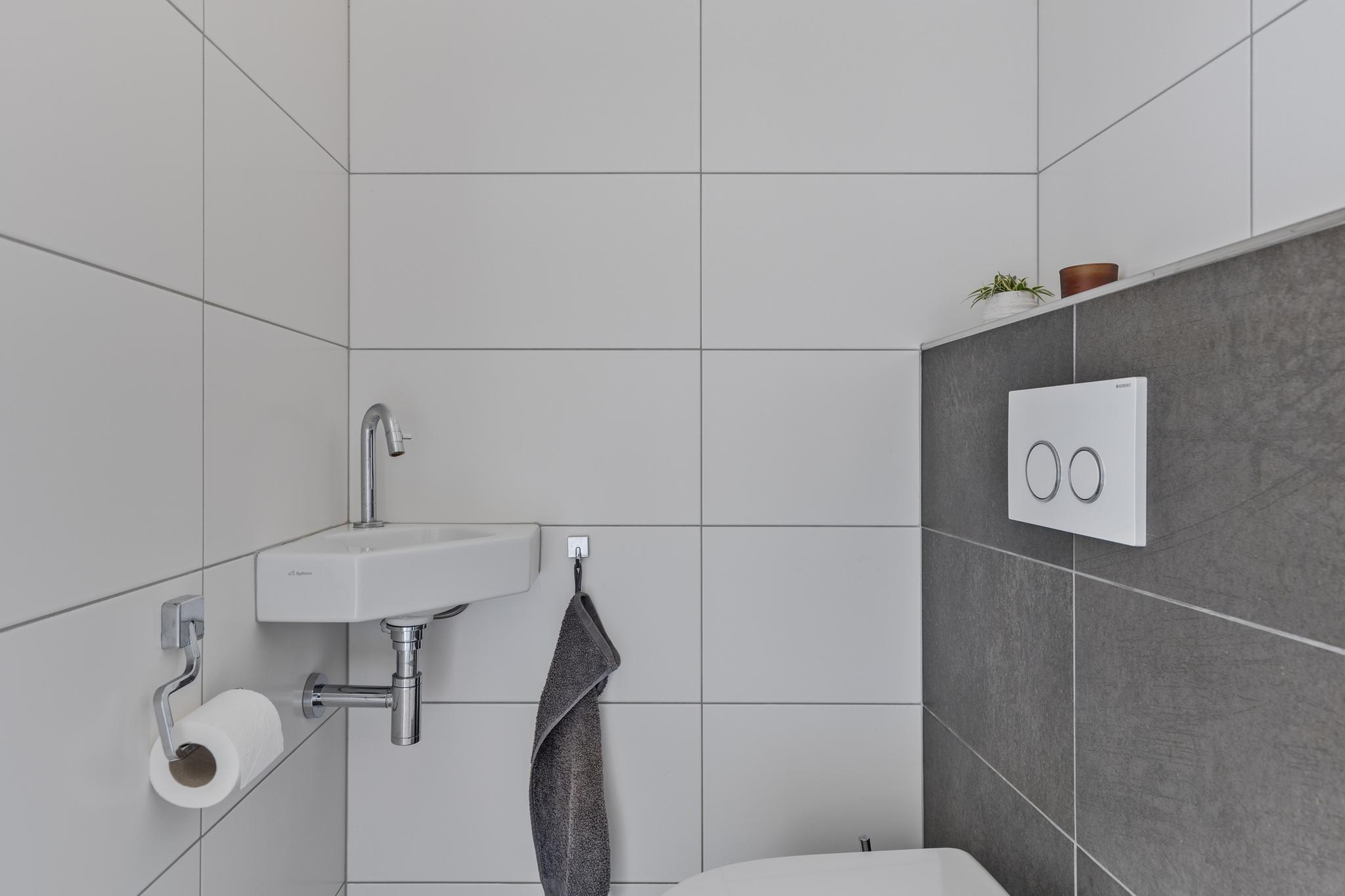 We komen binnen in de ruime, centrale entree/hal met meterkast, modern toilet met fonteintje en een bergkast met aansluiting voor wasmachine/droger, evenals de CV (Intergas HR 2022) en de WTW (warmte-terugwin)-unit.